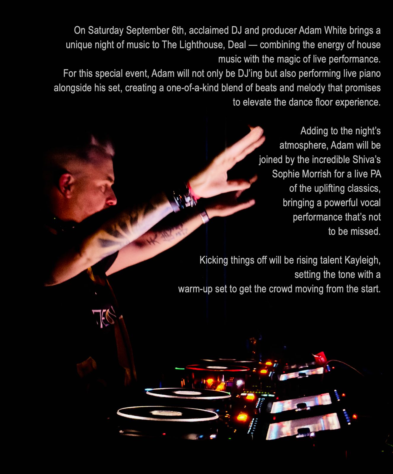 On Saturday September 6th, acclaimed DJ and producer Adam White brings a unique night of music to The Lighthouse, Deal — combining the energy of house music with the magic of live performance.